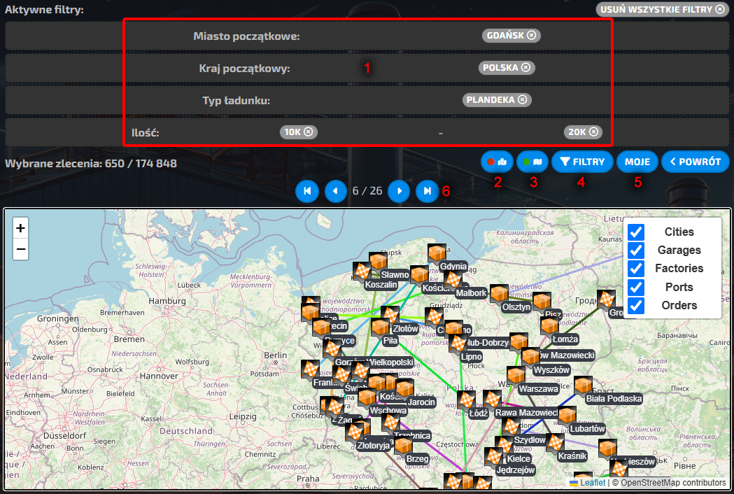 Pod mapą wyświetlają się możliwe do przyjęcia zlecenia, jednak może być ich sporo i by ułatwić wyszukanie tego, które nas interesuje na mapie, aktywujemy ten przycisk by kropka zmieniła się na zielony kolor i wtedy poruszając się po mapie i przybliżając do interesującego nas zlecenia (flaga), lista pod mapą zaczyna wyświetlać tylko to co widzimy w obrębie mapy.